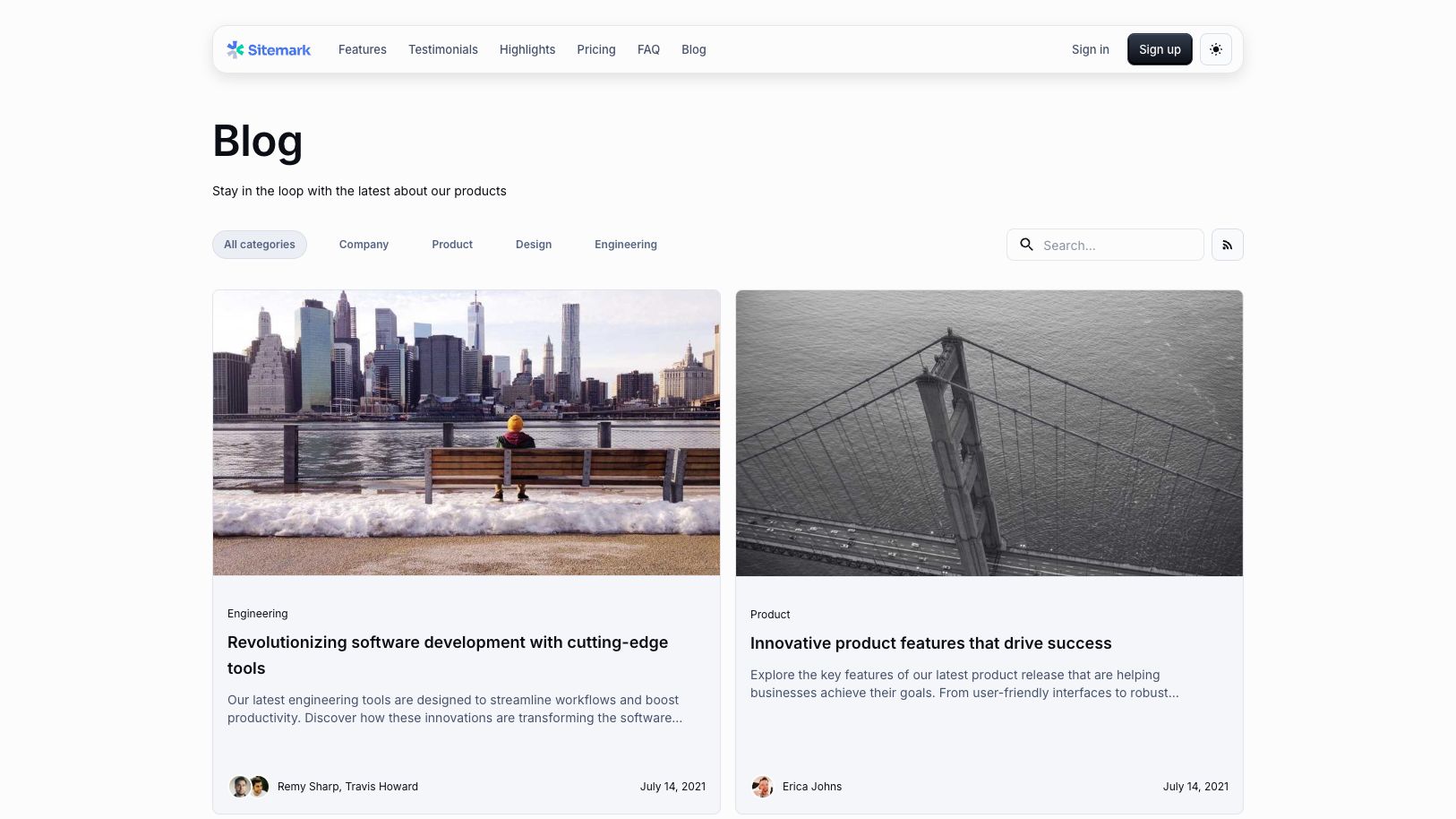 A sleek, modern blog homepage layout with Markdown support via markdown-to-jsx.